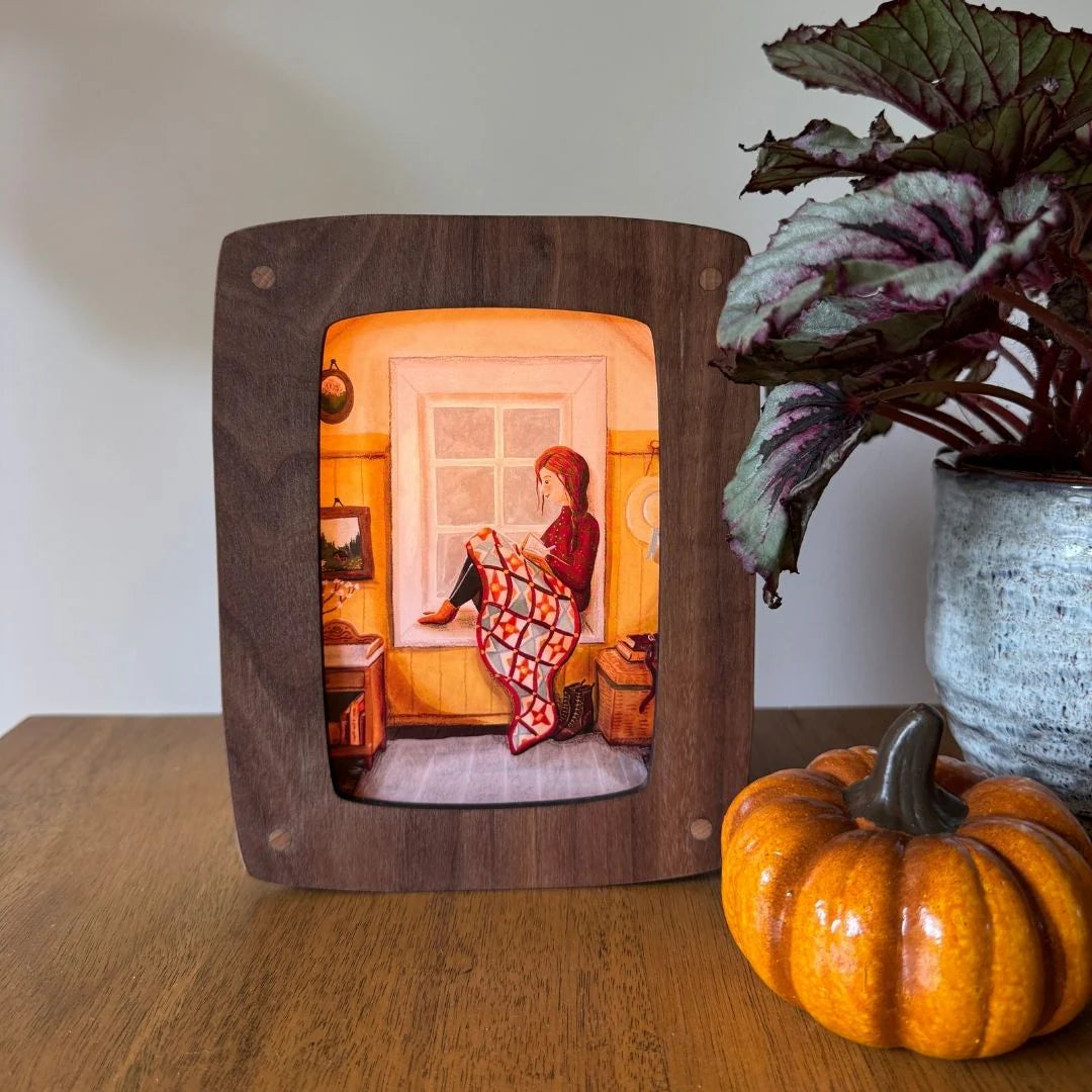 Laat je favoriete illustraties echt tot leven komen met dit sfeervolle kaartenlampje! Gemaakt van prachtig notenhout en omspannen met textiel. Schuif eenvoudig een A6-kaart bovenin en verander de sfeer in een handomdraai. Perfect om mee te wisselen met het seizoen, een moment of gewoon je gevoel!