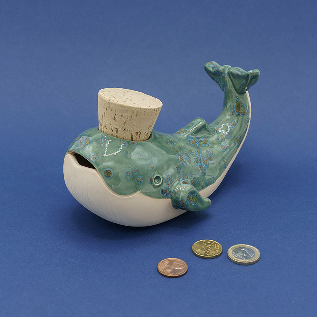 Deze vriendelijke walvis houdt van schatten verzamelen, hij vindt ze niet in de oceaan, maar gewoon bij jou thuis! De handgemaakte spaarpot is gemaakt van hoogwaardig keramiek en heeft bovenop een grote kurken stop, waarmee hij al je muntjes en briefgeld veilig bewaart. Praktisch, duurzaam en nét even anders dan de standaard spaarpot.